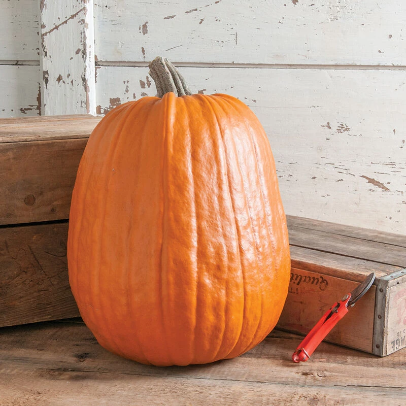 Elongated and blocky, medium-dark orange fruits are uniform in shape. Excellent size potential, fruits range 25-40 lb. avg. 30 lb. Stocky handles, light ribs, and long vine habit. Easy to grow for such a large-fruited type, Early Giant is also well adapted and a reliable producer. Tall fruits with rich color attract attention at roadside stands and farmers’ markets. Performs well on moderate spacing (about 30 sq.ft per plant). Also available treated.